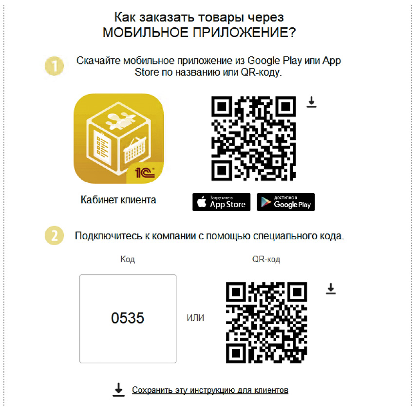 МагазинСообщите клиентам QR-код, ссылку или название приложения для скачивания на мобильное устройство, а также код для подключения к вашему магазину. Эта информация будет автоматически предоставлена на заключительном шаге работы в конструкторе. ![]() |